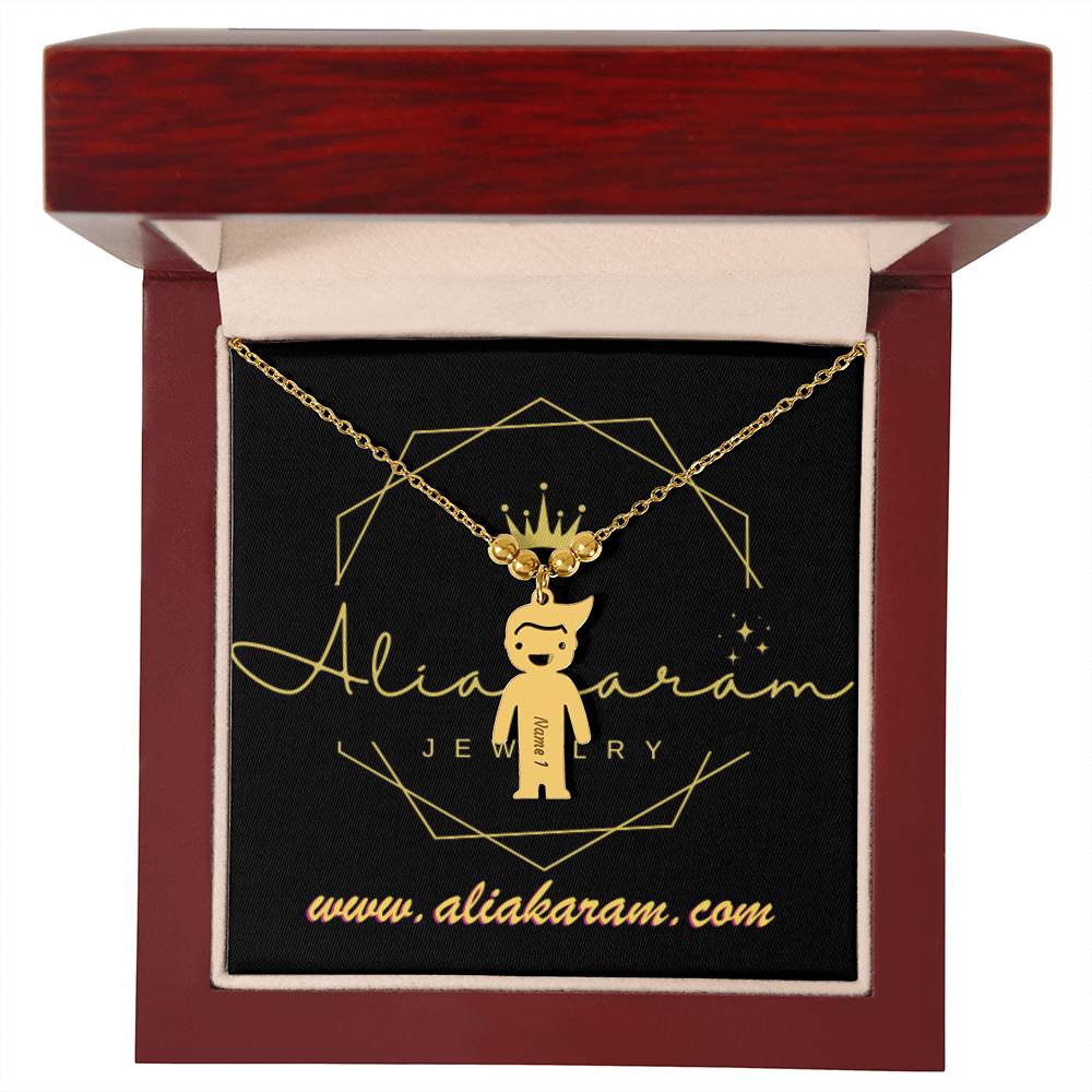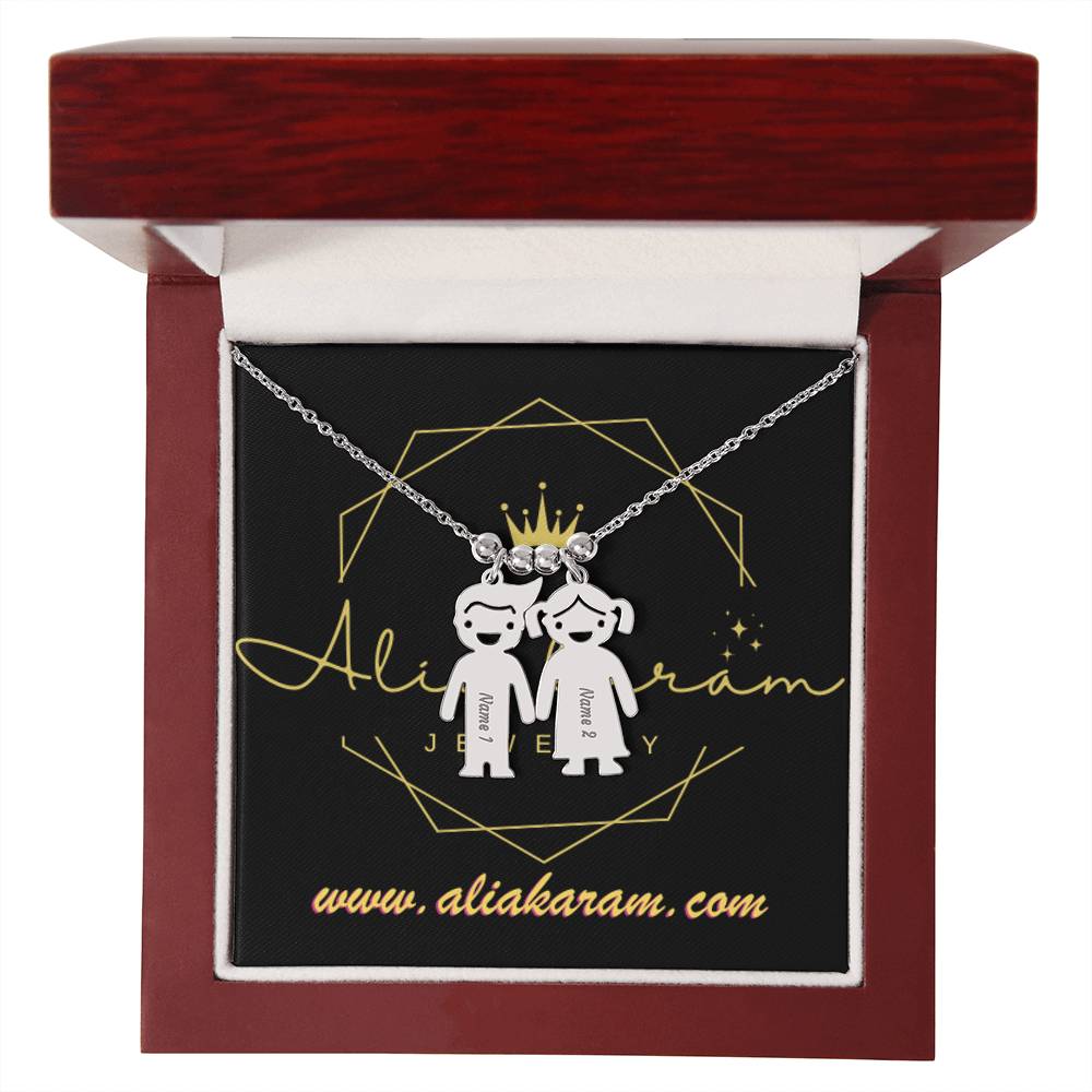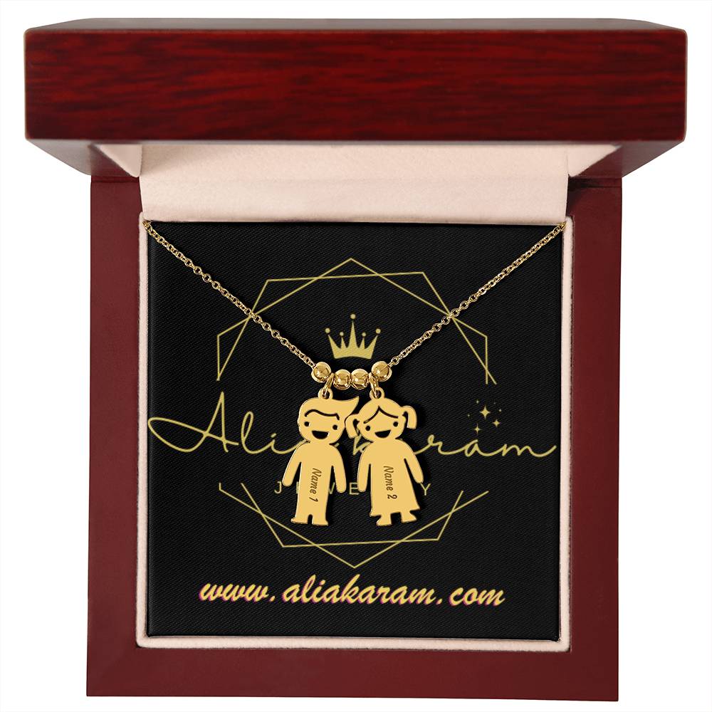 This unforgettable gift will leave her speechless! Introducing the Engraved Kids Charm Necklace. This necklace features up to three engraved charms, each shaped like a child, and can be personalized with the name or word of your choice. Made with high-quality materials, this necklace is a perfect gift for mothers and grandmothers who want to keep their children or grandchildren close to their heart. Whether you want to commemorate a special moment, celebrate a milestone, or simply express your love, this necklace is a perfect way to do it.